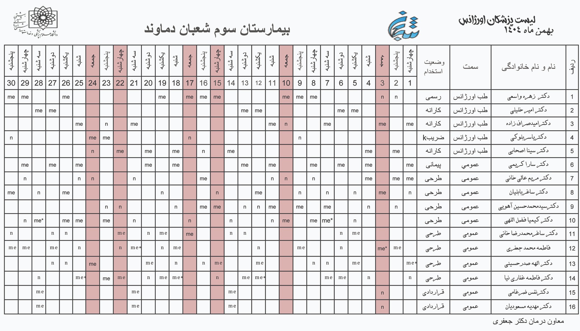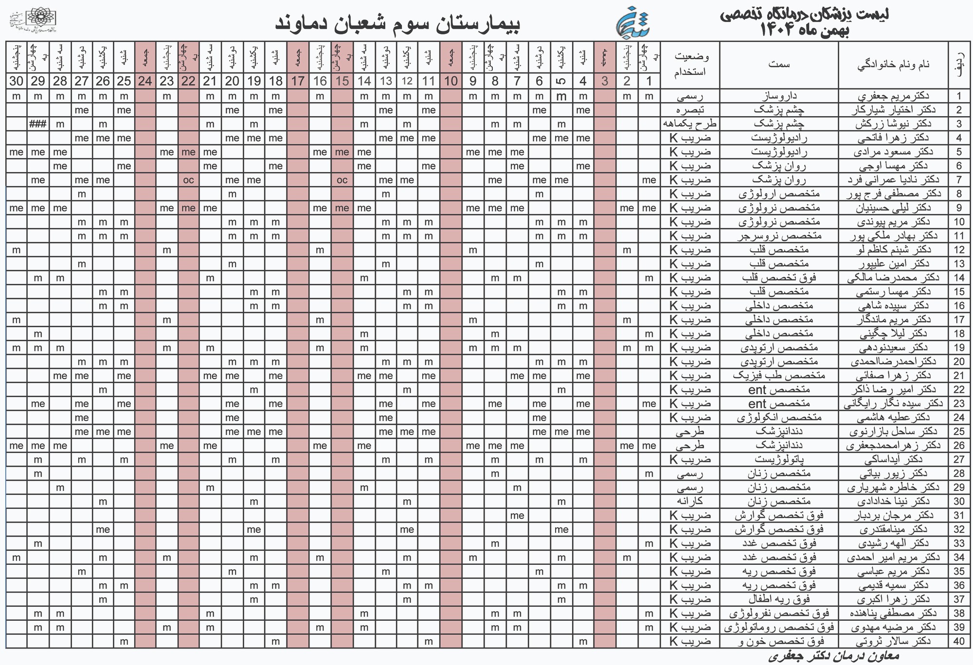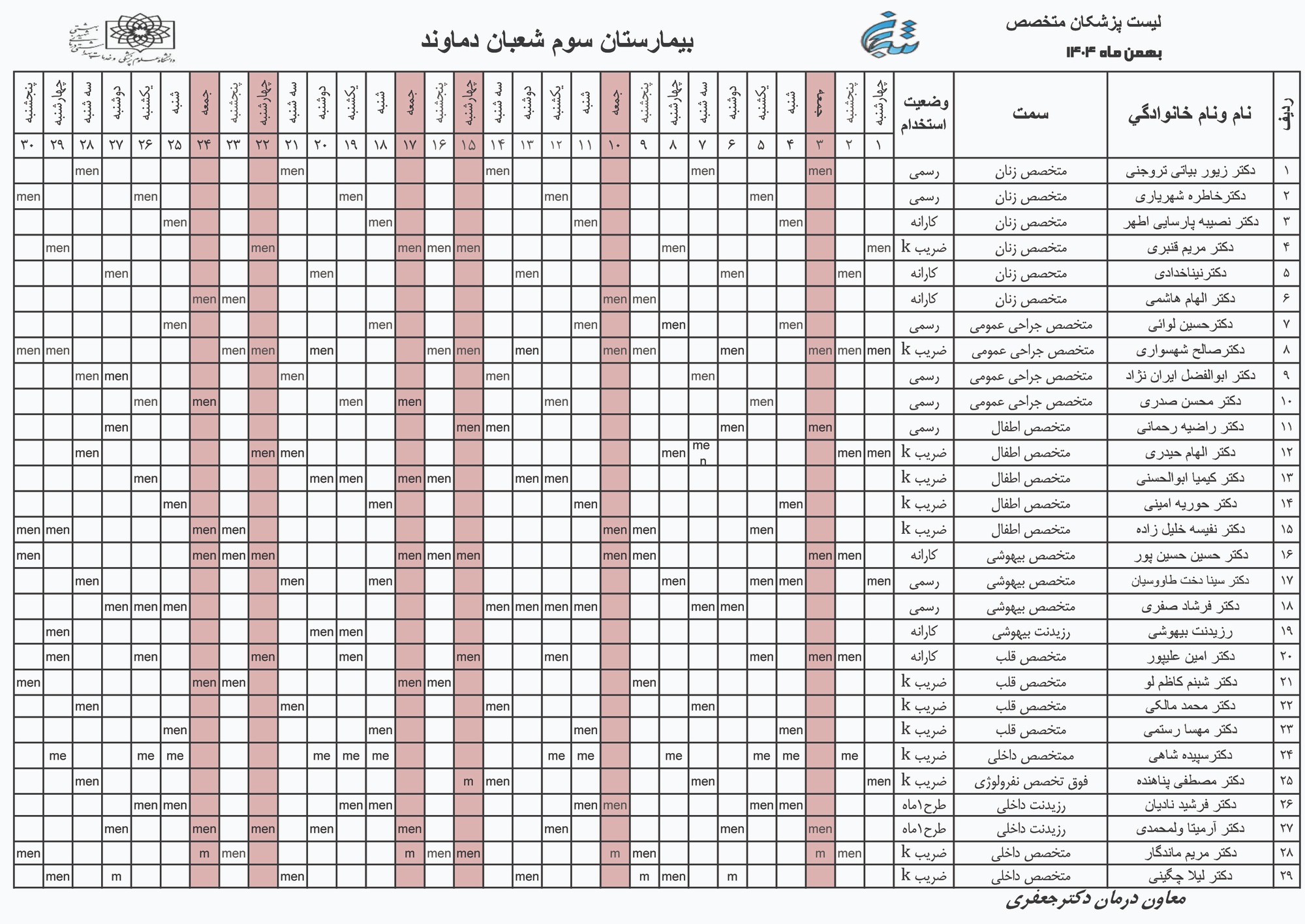 برنامه پزشکان بیمارستان سوم شعبان دماوند ( بهمن ماه 1404 )
